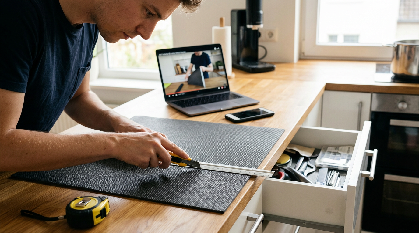 Der Prozess beginnt mit der Reinigung der Schublade und endet mit dem Einlegen der fertig zugeschnittenen Matte. Dazwischen liegen präzise Arbeitsschritte, die Ruhe und eine ebene Arbeitsfläche erfordern. Es empfiehlt sich, die Matte vor dem Zuschnitt einige Zeit flach auszulegen, damit sich eventuelle Rollneigungen legen können.